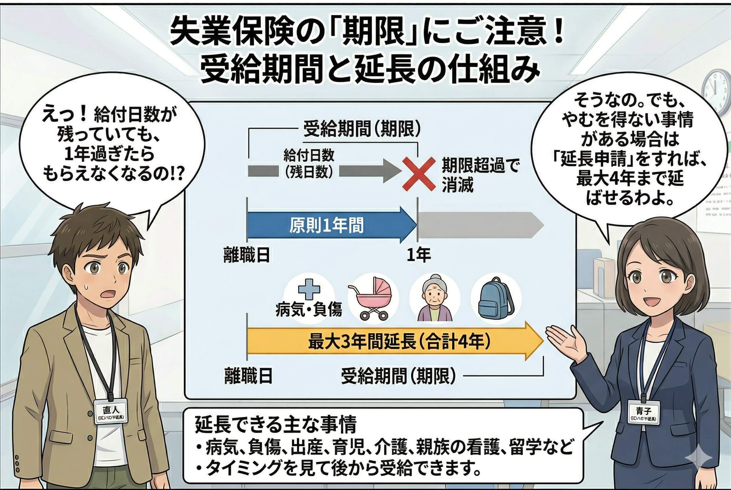 失業保険には「もらえる期間(所定給付日数)」とは別に、受給できる期限(受給期間)が設けられています。