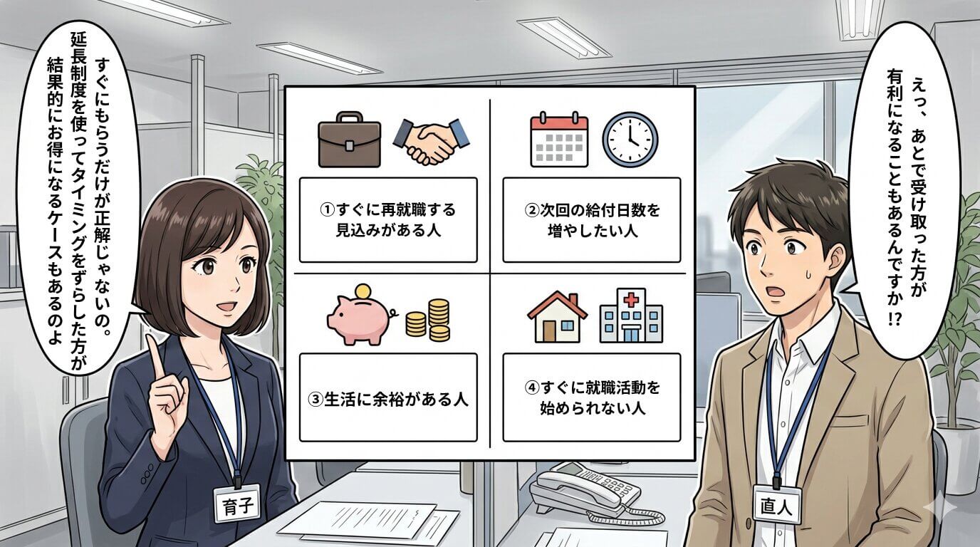 特に「しばらく療養したい」「資格の勉強をしたい」「家族の介護が落ち着いてから働きたい」という人にとって、延長制度は非常に有効な選択肢になります。