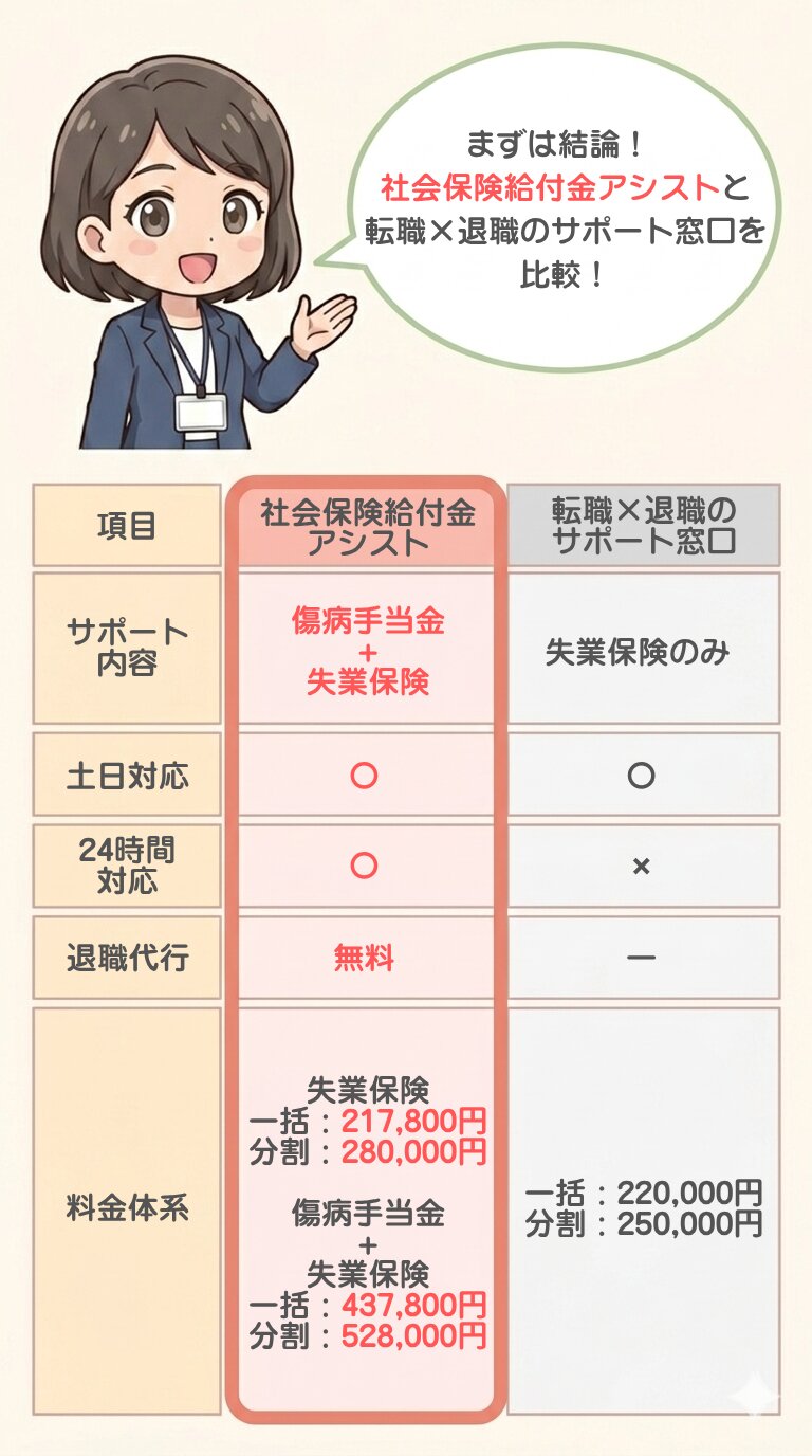ここまで 転職×退職のサポート窓口 と 社会保険給付金アシスト の違いを整理してきました。