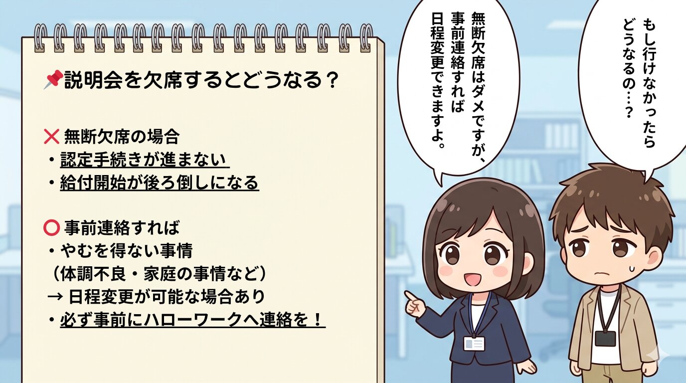 説明会は失業認定を受けるための重要な手続きの一部であり、無断欠席すると認定日が設定されないこともあります。