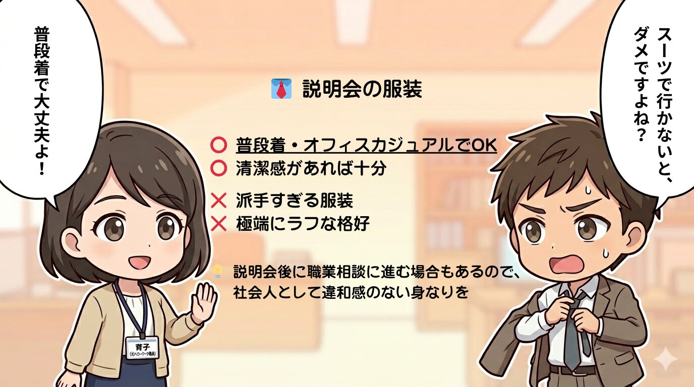 説明会後に職業相談へ進む場合もあるため、社会人として違和感のない身なりを意識しましょう。