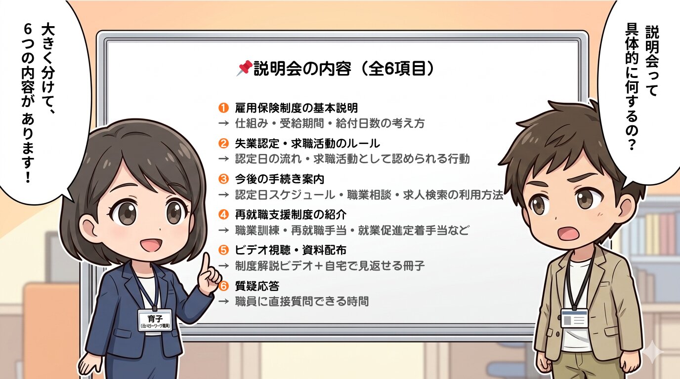 - 説明会では、失業保険の仕組みや求職活動のルールが説明される