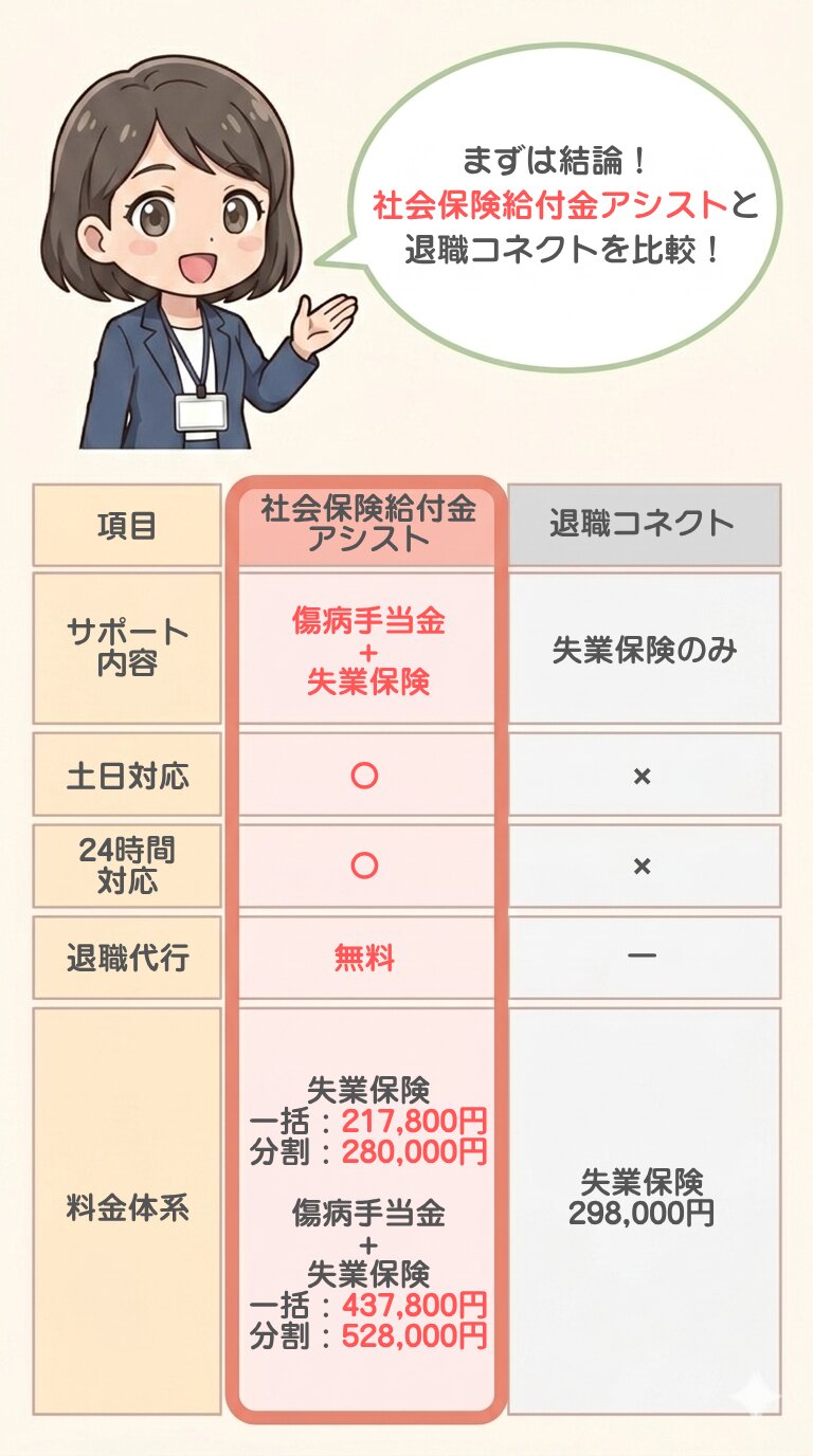 退職コネクトが、失業保険を中心にサポートを行っているのに対し、社会保険給付金アシストでは、失業保険・傷病手当金を含めた複数の給付制度を横断的に整理しながら相談できる体制が用意されています。
