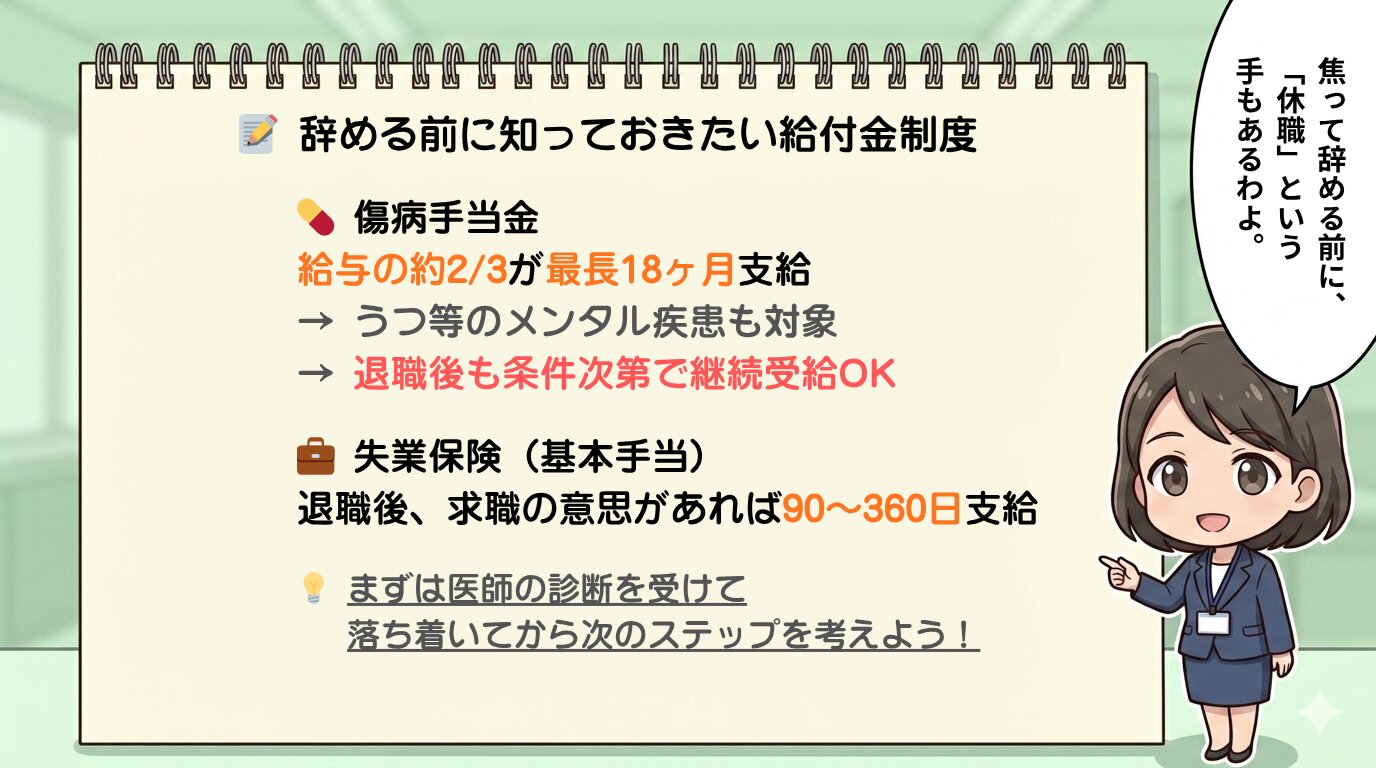 まずは傷病手当金などの給付金制度を活用し、経済的な安心を確保した上で、心身をゆっくり休めることが、結果として最も良い転職への近道となります。