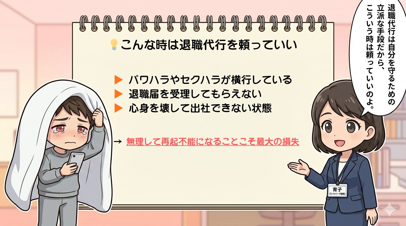 • 自分を守る権利: パワハラやメンタル不調があるなら、代行はあなたを守るための正当な手段である。